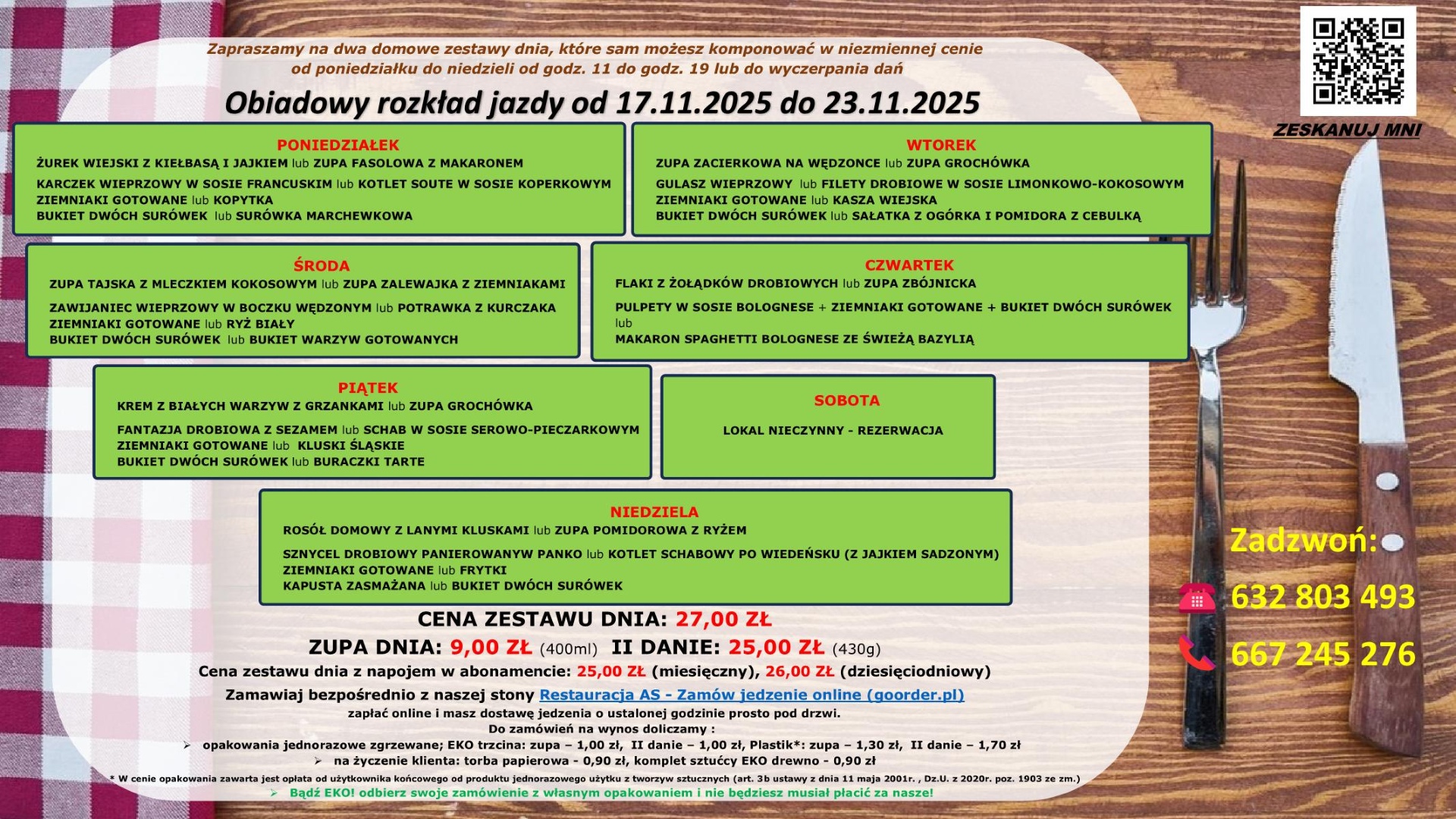 Do obiadu w opcji na wynos i dowóz doliczamy opakowania jednorazowe zgrzewane; EKO trzcina : zupa – 1,00 zł, II danie – 1,00 zł lub Plastik* : zupa - 1,30 zł, II danie - 1,70 zł.